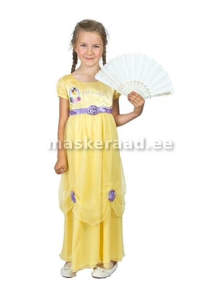 Printsess kaunitar helekollases lilla roosiga siidkleidis